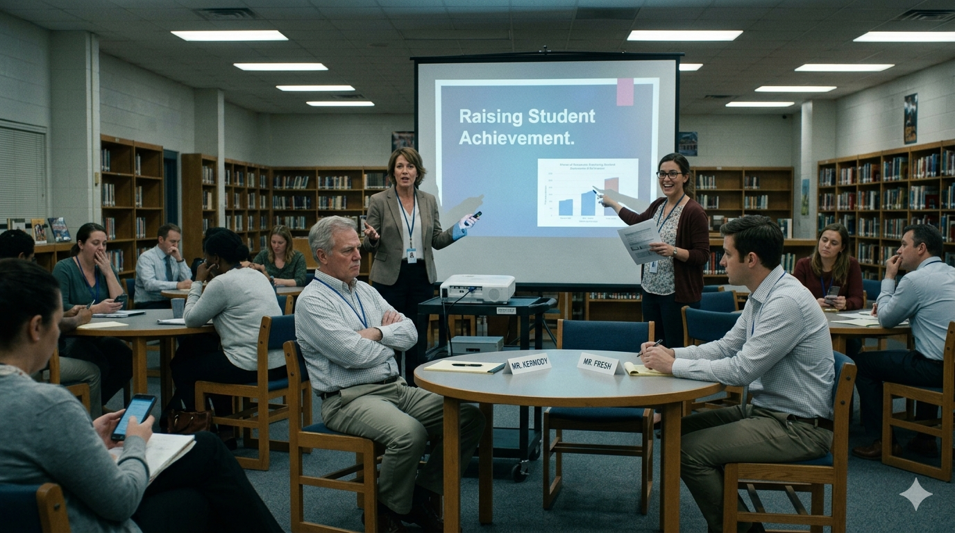 (The setting: A fluorescent-lit high school library, projector humming quietly, displaying a “Raising Student Achievement” slide. Teachers sit in small groups, minds somewhere between the beach and denial.)